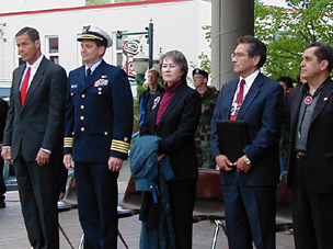 "We honor all of our Southeast Alaska veterans today," said Knowles at the memorial dedication ceremony. "More than ever, America appreciates its military and its mission to protect us from terrorism. Their task is daunting, but it can and will be accomplished, just as veterans who served in the past completed their missions." Knowles thanked those who organized and supported the memorial's construction, including the Southeast Alaska Native Veterans organization and Sealaska Corporation. The new memorial to Southeast Alaska Native veterans, located in Juneau's Sealaska Plaza, features a large, inscribed piece of white marble quarried from lands owned by Sealaska Corporation, along with a set of smaller memorial stones inscribed with the Tlingit, Haida, and Tsimshian words for "warrior" and "courage." Knowles noted that Alaska Natives and American Indians have served the U.S. in every major war in the nation's history. They have the highest per capita service record of any ethnic group in the country, and many today proudly serve in the active forces and in the Alaska National Guard and reserves. At a separate ceremony, Knowles awarded the Alaska Territorial Guard medal to longtime Juneau resident Ralph L. Kibby, Sr. At the age of 16, Kibby signed up to serve in the Alaska Territorial Guard in 1943, in the midst of World War II. After being honorably discharged in 1944, he served with the regular U.S. Army for two more years, receiving the World War II Victory Medal for his service. The Alaska Territorial Guard medal is awarded to those who served in the Guard "in recognition of their contributions and achievements as members of the Alaska Territorial Guard from 1942-1947."